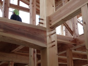 3方向から敷き梁と胴差しが2本差さってお互いに引きつけ合うように木栓を打ち込んでいます。これも昔ながらの伝統的な大黒柱や通し柱の仕口です。もちろん金物など使わず木組だけで強度は充分です。