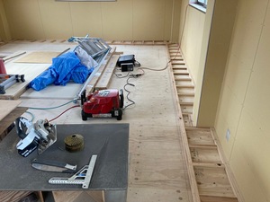 角度を変えて撮った根太下地の様子です。このうえに構造用合板を張っていきます。