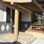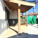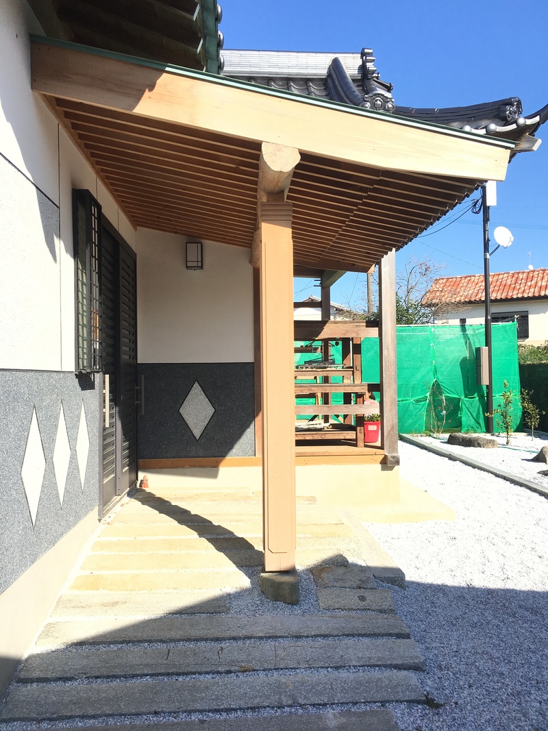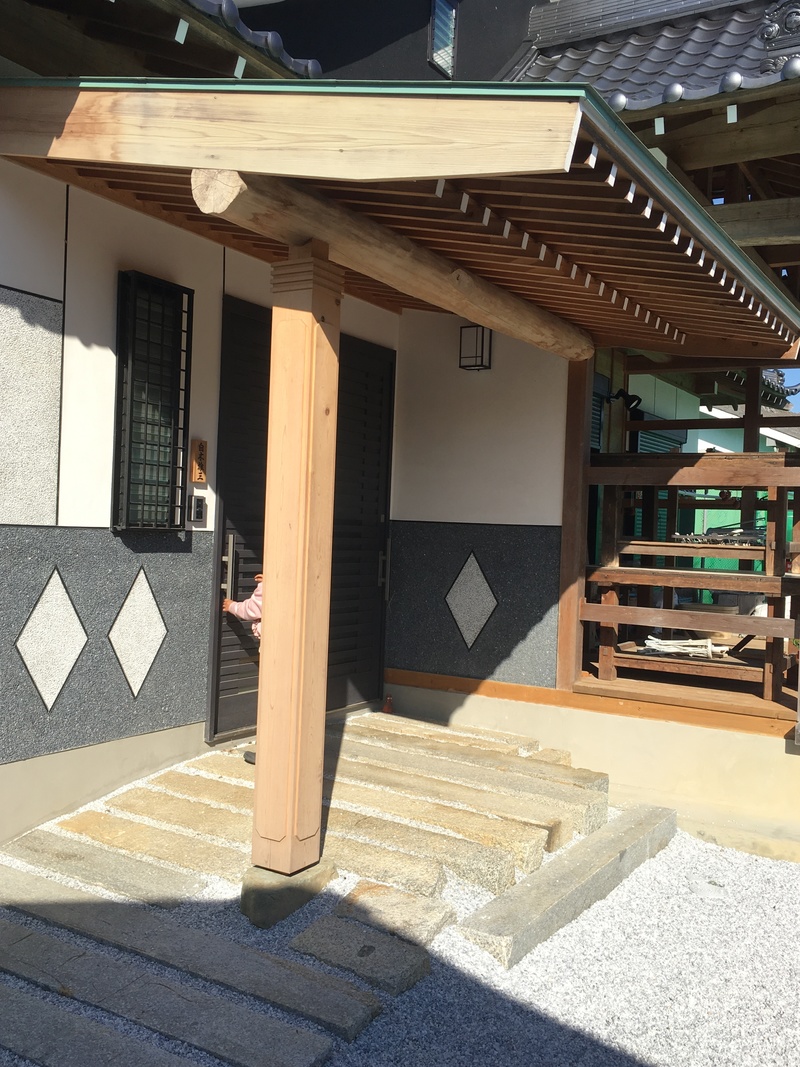 ②玄関ポーチですが爺ちゃんの家に使われていた御影石のスロープと天然石の靴石と蛇腹と上部に三本鉢巻サクリを設えた檜のポーチ柱、腰壁は洗い出し、庇は飛燕垂木仕上げにしました。