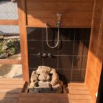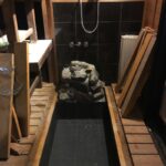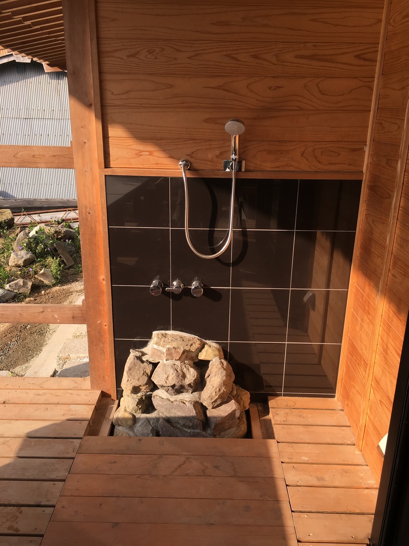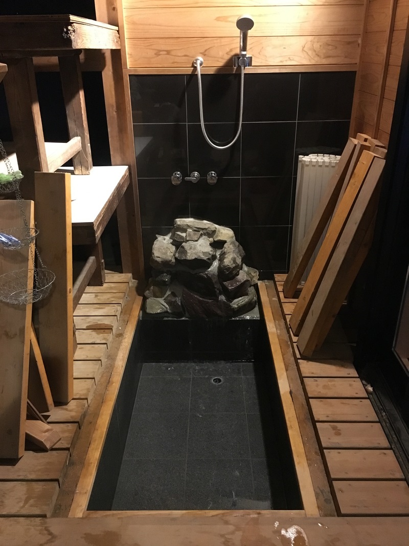 ⑤テラスの床板を取り外せば「なんということでしょう。露天風呂が現れたではないですか!?」テラスの基礎を利用して浴槽を造り黒御影石を貼って仕上げました。庭の夜桜を見ながらのひと時は本当に最高ですよ。
