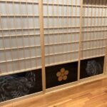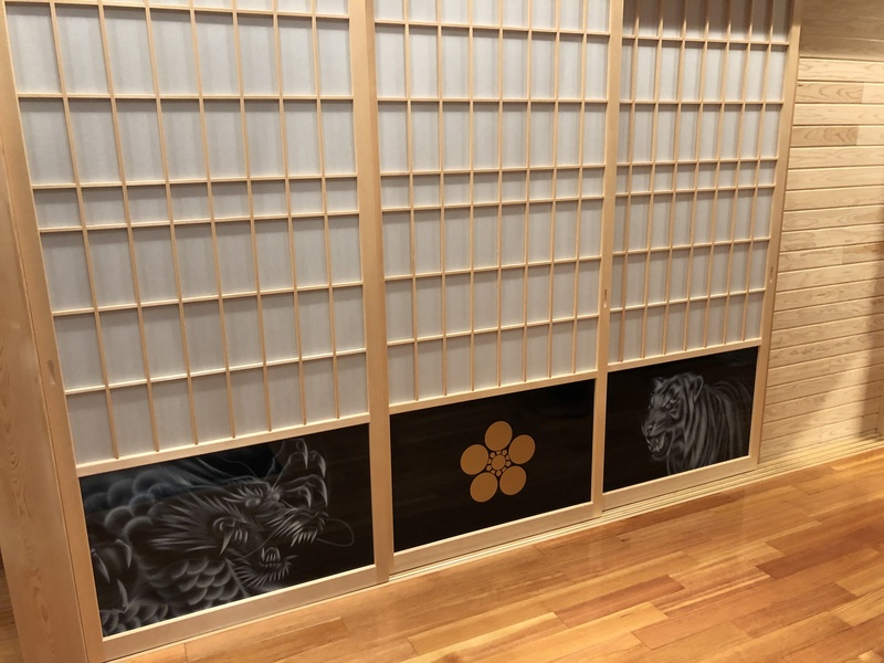 ⑥リビングと座敷を隔てる建具ですが、この家の仕上げの中で私が一番こだわった龍虎対面の腰板と中央に男紋をエアブラシで描いてもらい、建具の格子のデザインも私が考えて作ってもらいました。