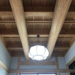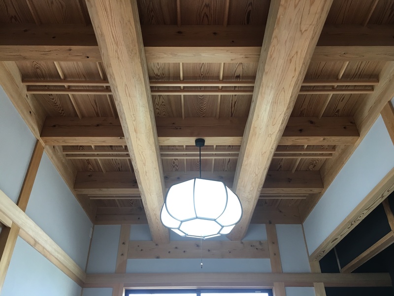 大黒柱まで延びた敷き梁と屋根荷重を支える敷き梁の上に化粧梁を3尺間隔で組み、その間に猿面の格子を組み、その下に直交方向に吹き寄せ格子を組んで杉の一枚板の天井板を張って仕上げました。