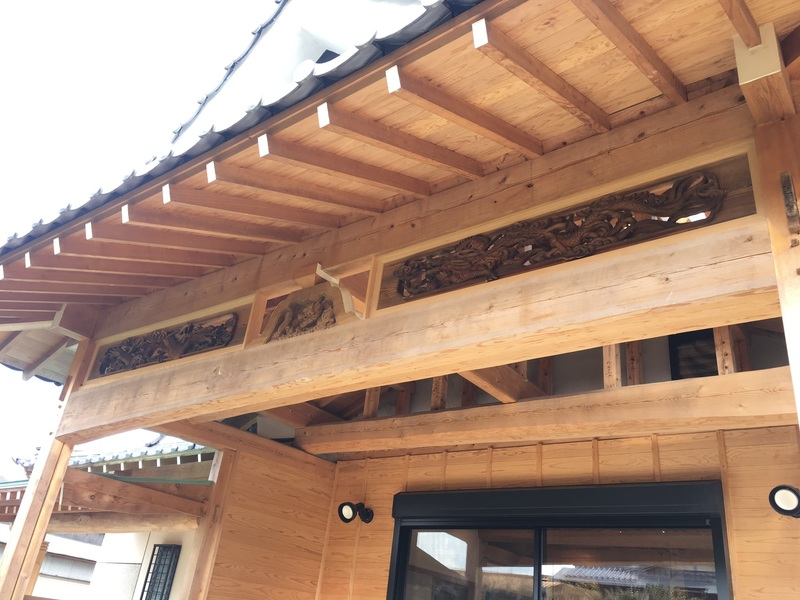 ①屋根付きテラスですが、下屋で屋根を造らず、付け入母屋の反り屋根にし虹梁を入れ龍の蟇股と球を持った龍が一匹と球を持ってない龍が彫られた彫刻欄間を設えました。